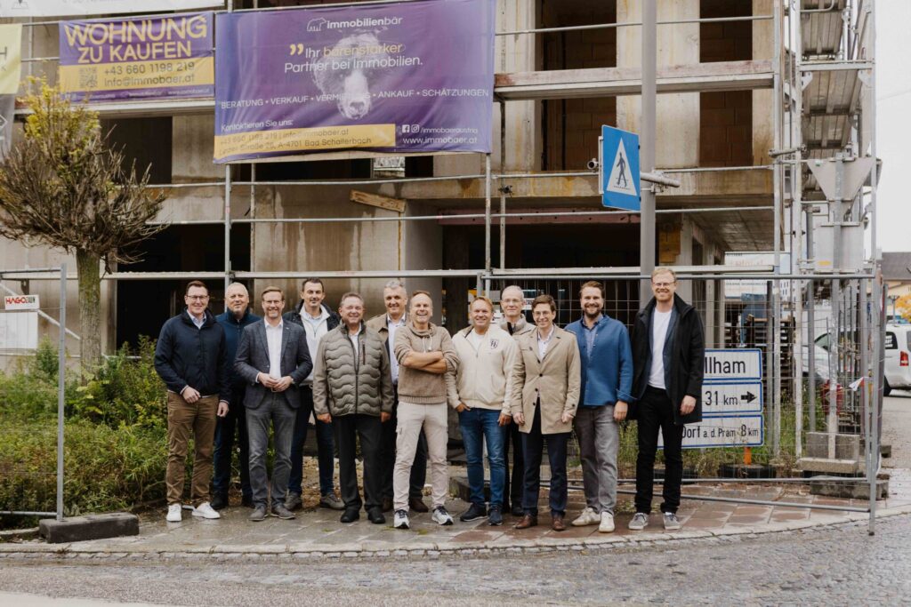 NEUMARKT IM HAUSRUCKKREIS: Nach rekordverdächtigen 11 Monaten Bauzeit ist der Rohbau samt Dach unseres Projekts „Mei Platzl“ in Neumarkt im Hausruckkreis fertiggestellt. Neben dem Raiffeisen Kompetenzzentrum im Erdgeschoss werden 23 Wohnungen realisiert. Wir feierten diesen Meilenstein mit Gemeinde, Bank und Crew. Schön wars 🙂
